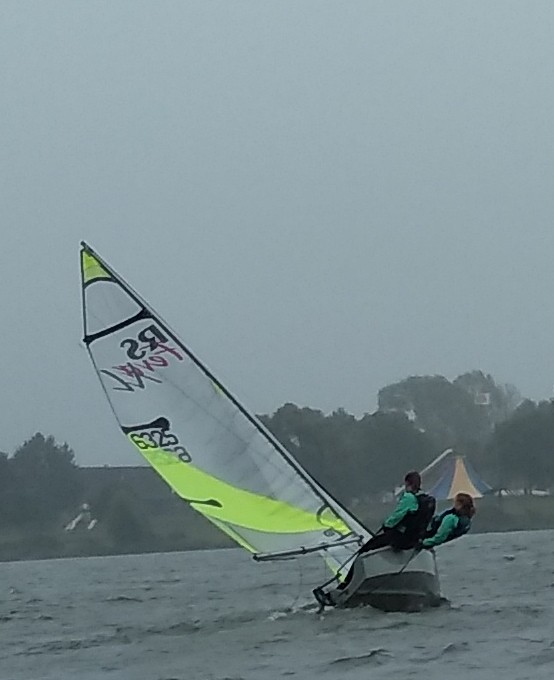 2 CWO-1 tjes hebben vanmorgen hun diploma gehaald en mogen voor het eerst meedoen. Het is iets te spannend gebleken en helpen daarna mee met de rescue c.q. wedstrijdleiding. We varen allen 1 manche, het veld ligt af en toe echt stil en er finishen 15 bootjes.